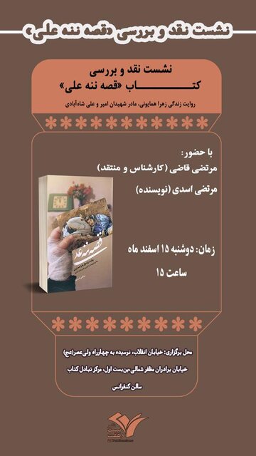 نشست نقد و بررسی کتاب «قصه ننه علی»، روایت زندگی زهرا همایونی مادر شهیدان امیر و علی شاه آبادی دوشنبه ۱۵اسفند در سالن کنفرانس مرکز تبادل کتاب برگزار میشود.